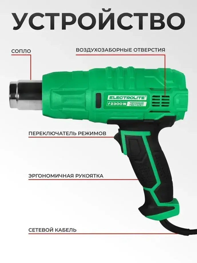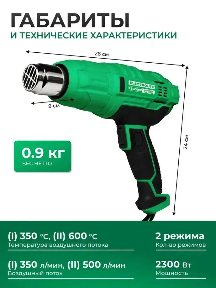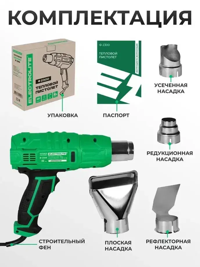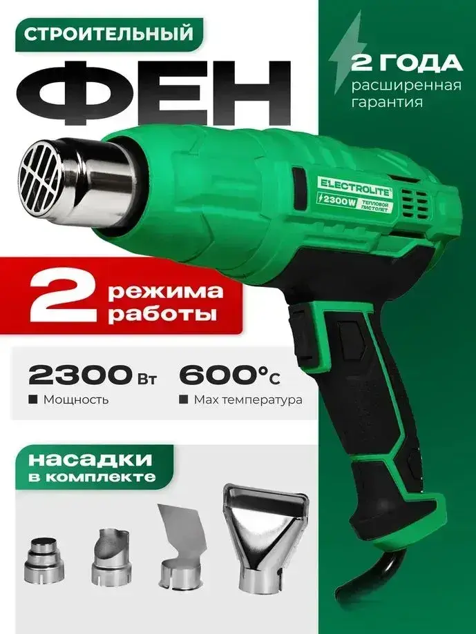 Фен строительный / технический ELECTROLITE Ф 2300 С НАБОРОМ ( 2300 Вт, 220 В, 400/600 С, 300/500 л/мин, резиновая рукоять )