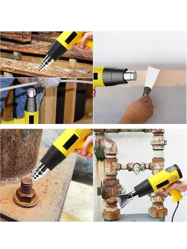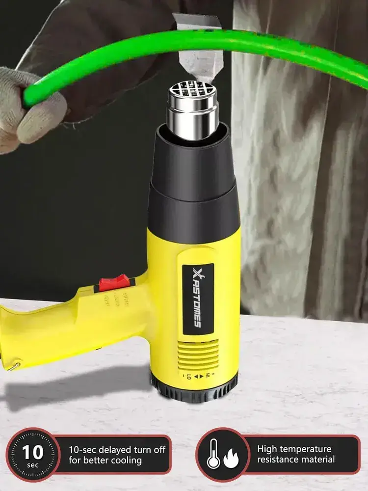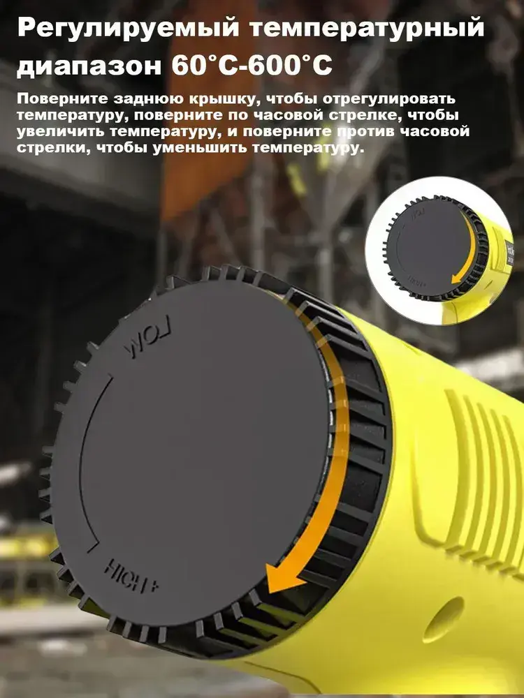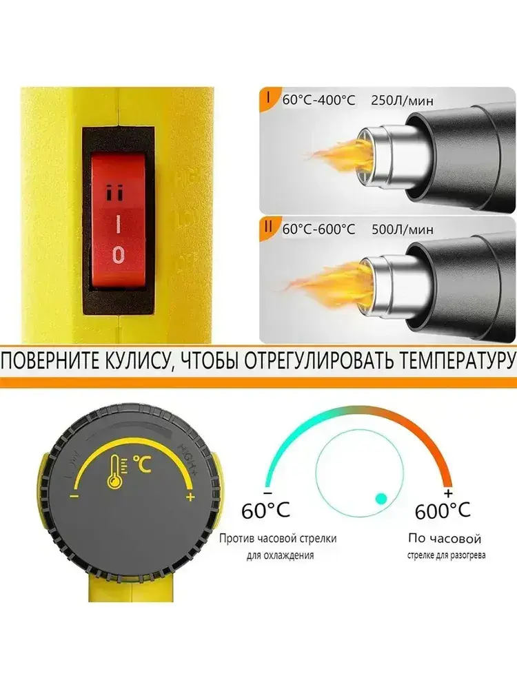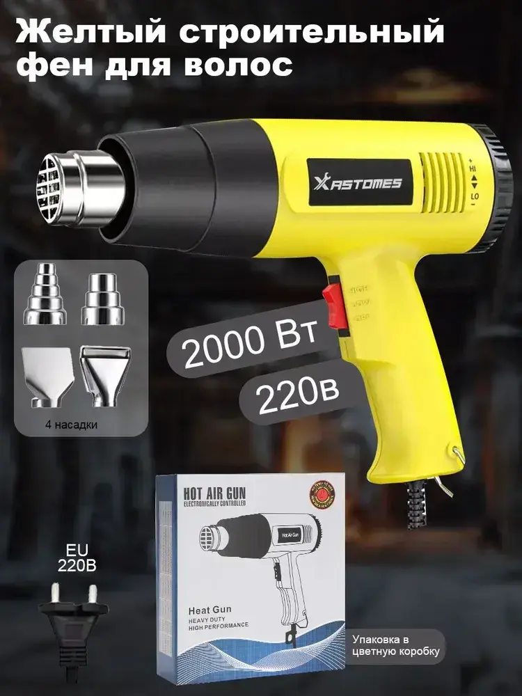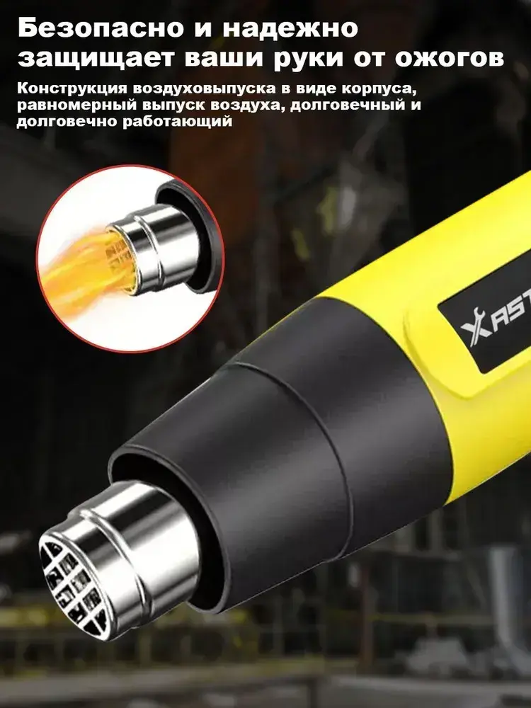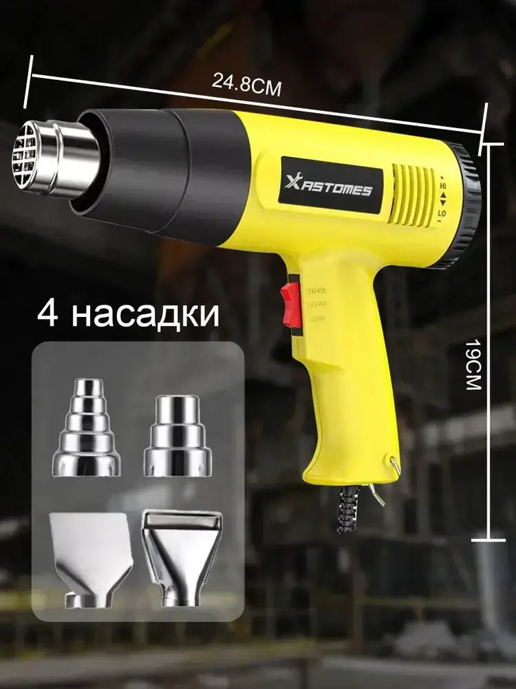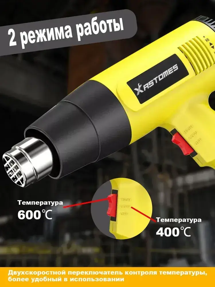 Фен строительный Xastomes 2000Вт с регулировкой температуры от 60 до 600 градусов,защита от перегрева, 220 В,4 насадки