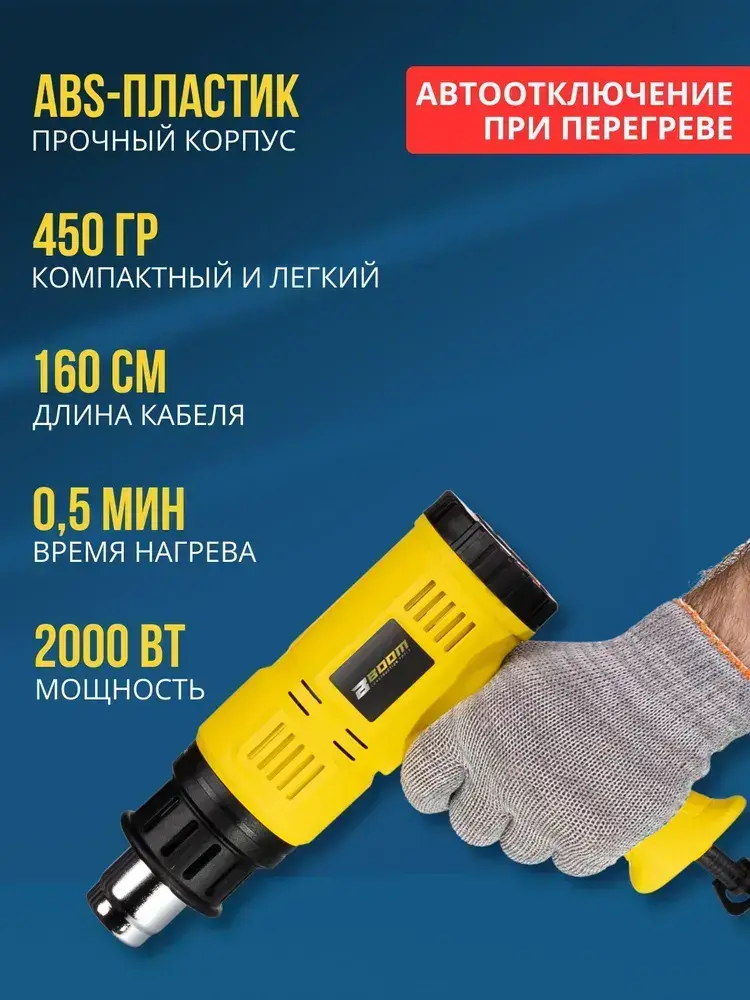 Фен технический строительный профессиональный Boom Hot Max 220V-230V 2000W промышленный с точной регулировкой температуры, 2 режимами скорости 250-500 л/мин, с LCD дисплеем
