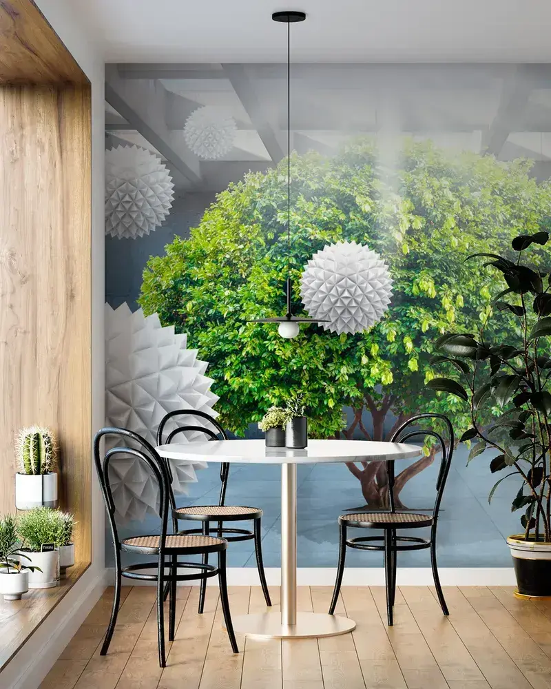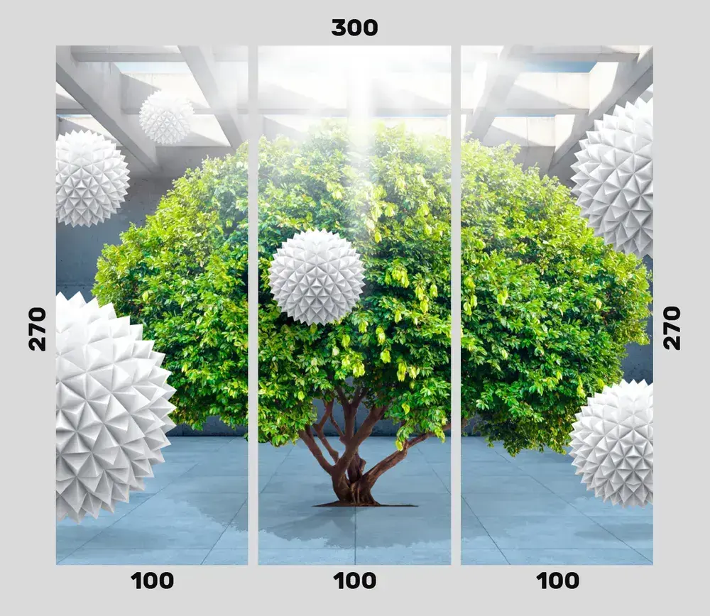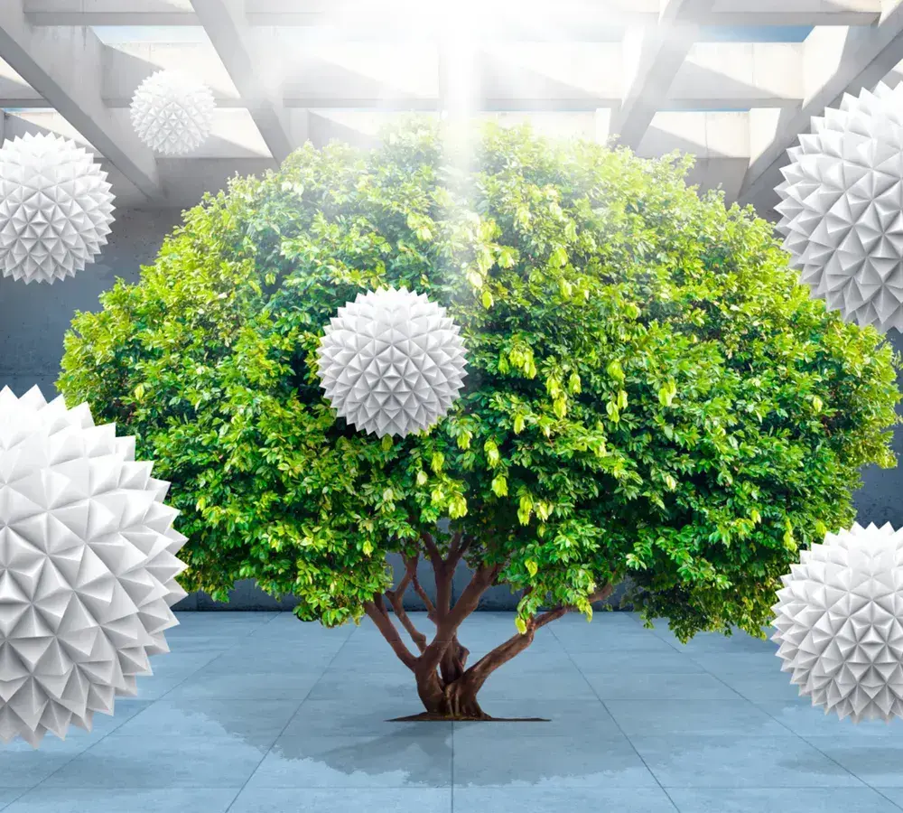 Фотообои виниловые на флизелиновой основе "Дерево с колючими шарами 3D зеленый", Арт. 13-076, 300х270см (ШхВ)