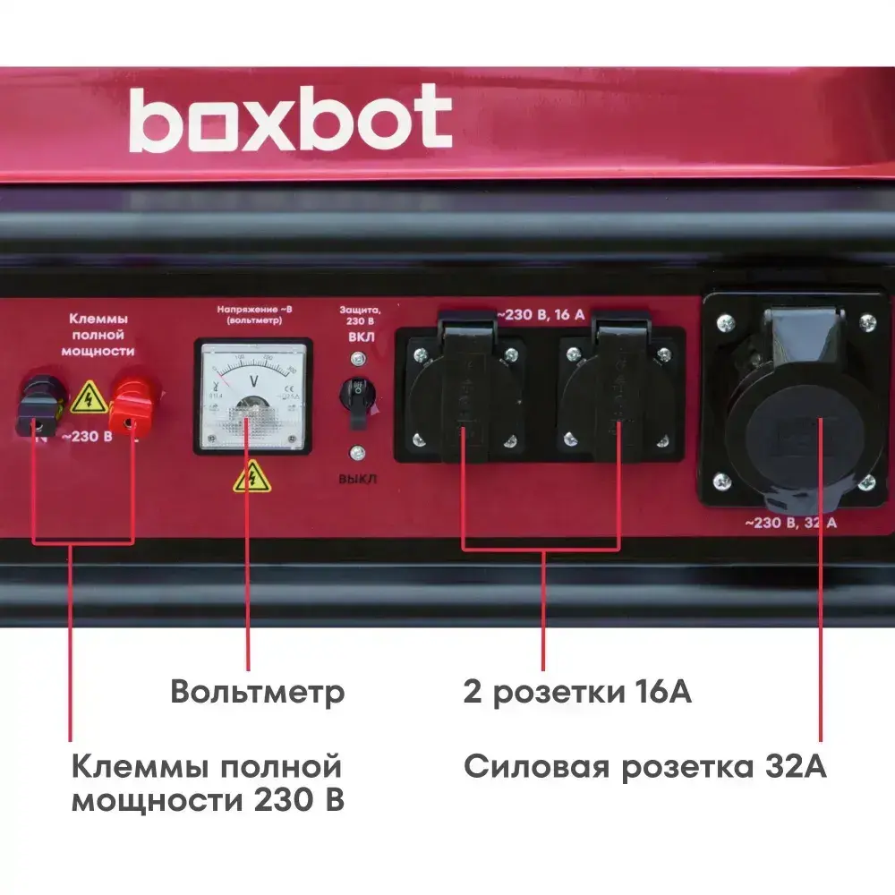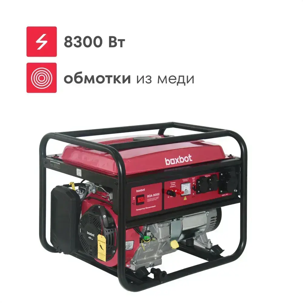 Генератор бензиновый Boxbot, 8.3 кВт, 25 л, 2 розетки 16А, силовая розетка, клеммы 230 В, свеча, BGA 8000