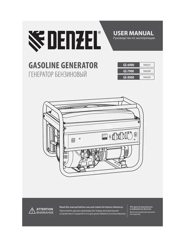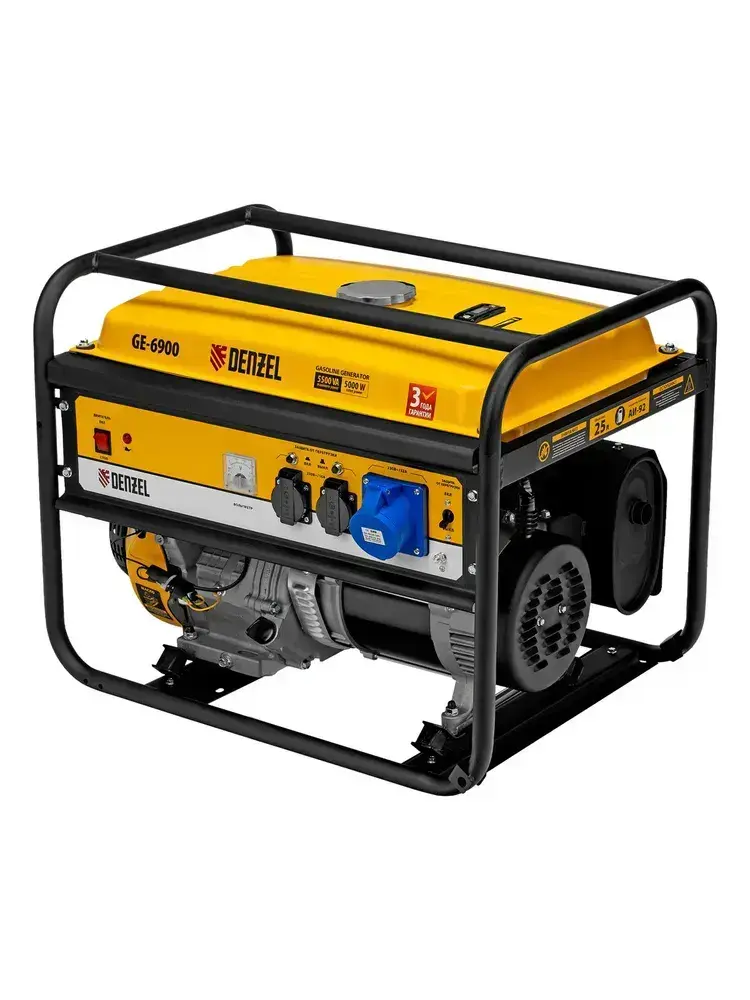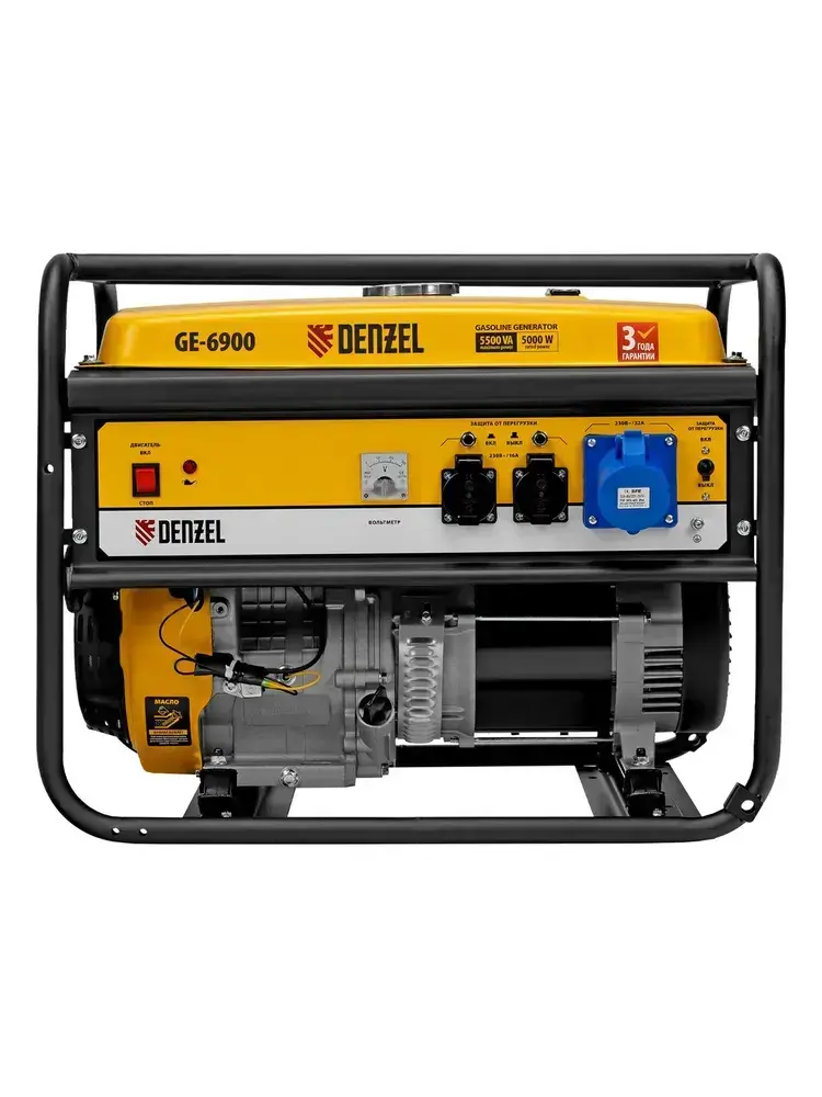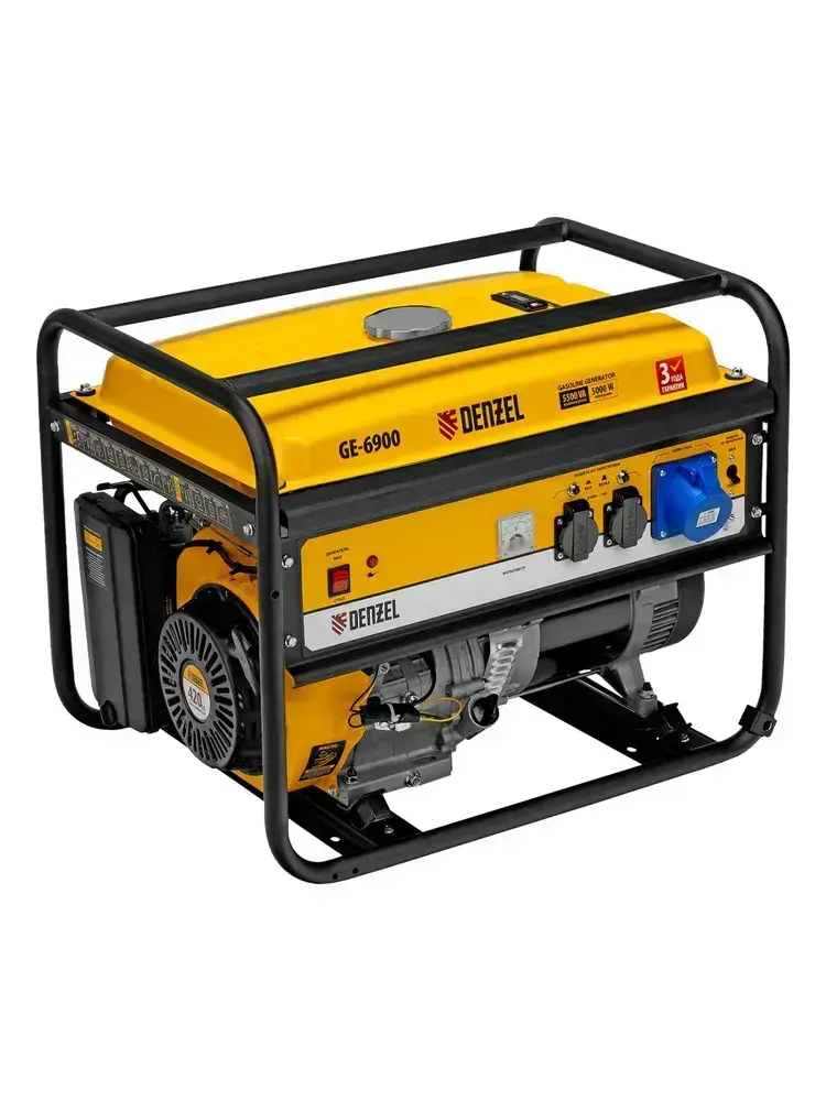 Генератор бензиновый DENZEL GE-6900, 5.5 кВт, 420 см3 объем двигателя, 220 В и 25 л объем топливного бака, ручной стартер и блок AVR, 3 розетки 94637