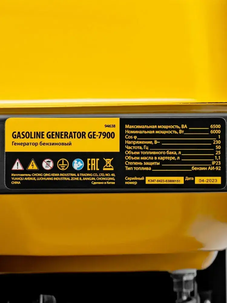 Генератор бензиновый DENZEL GE-7900, 6.5 кВт и 420 см3 объем двигателя, 220 В и 25 л объем топливного бака, ручной стартер и блок AVR, 3розетки и датчик уровня масла, 94638