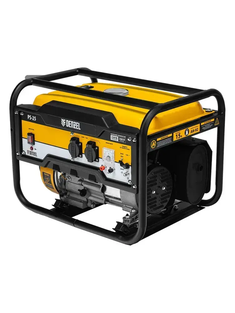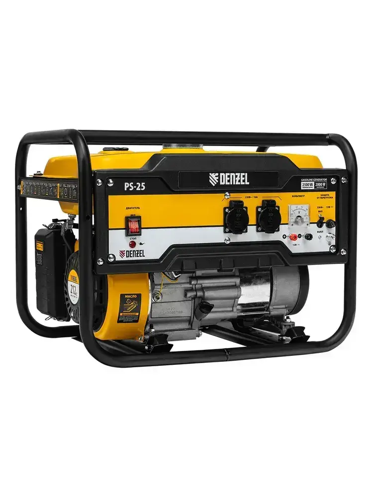 Генератор бензиновый DENZEL PS 25, 2.5 кВт и 212 см3 объем двигателя, 230 В и 15 л объем топливного бака, ручной стартер и блок AVR, 2 розетки16 А и выход постоянного тока 12 В, 946814