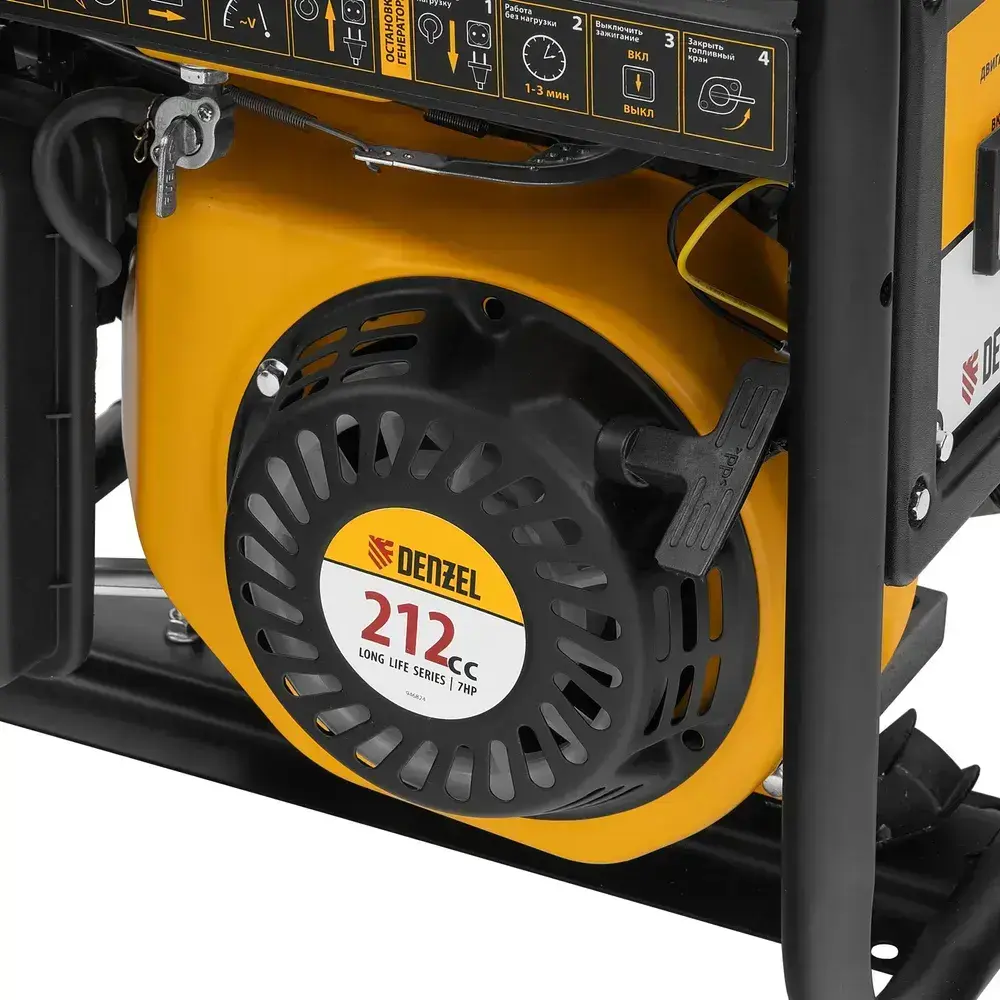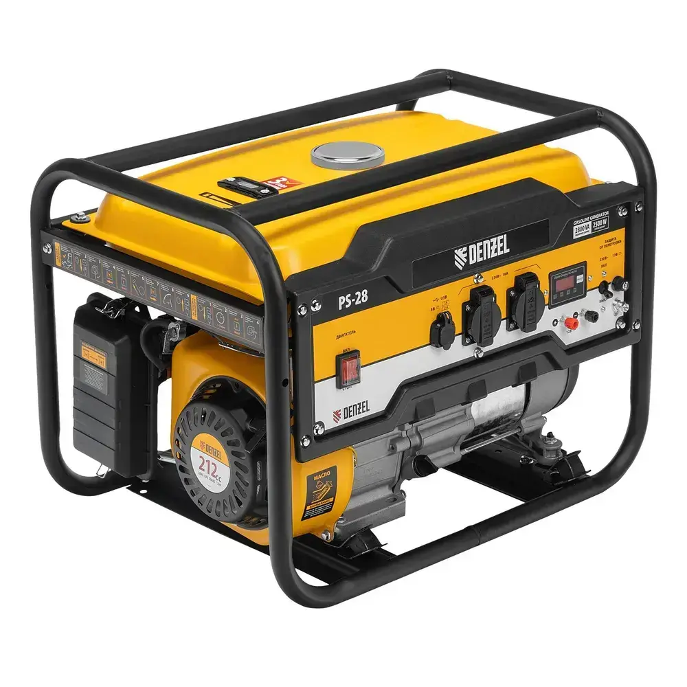 Генератор бензиновый DENZEL PS-28, 2.8 кВт и 212 см3 объем двигателя, 230 В, 15 л объем топливного бака, ручной стартер и блок AVR, 2 розетки 16 А и выход постоянного тока 12 В/USB 5В 946824