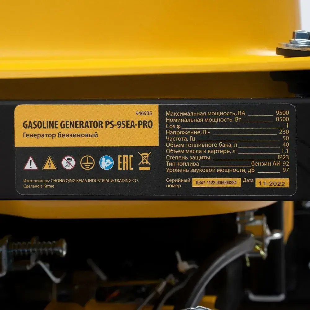 Генератор бензиновый DENZEL PS-95EA-PRO, 9.5 кВт мощность и 485 см3 объем двигателя, 40 л объем топливного бака, электростарт и блок AVR, 3 розетки и выход USB 5 В, силовые клеммы, 946935