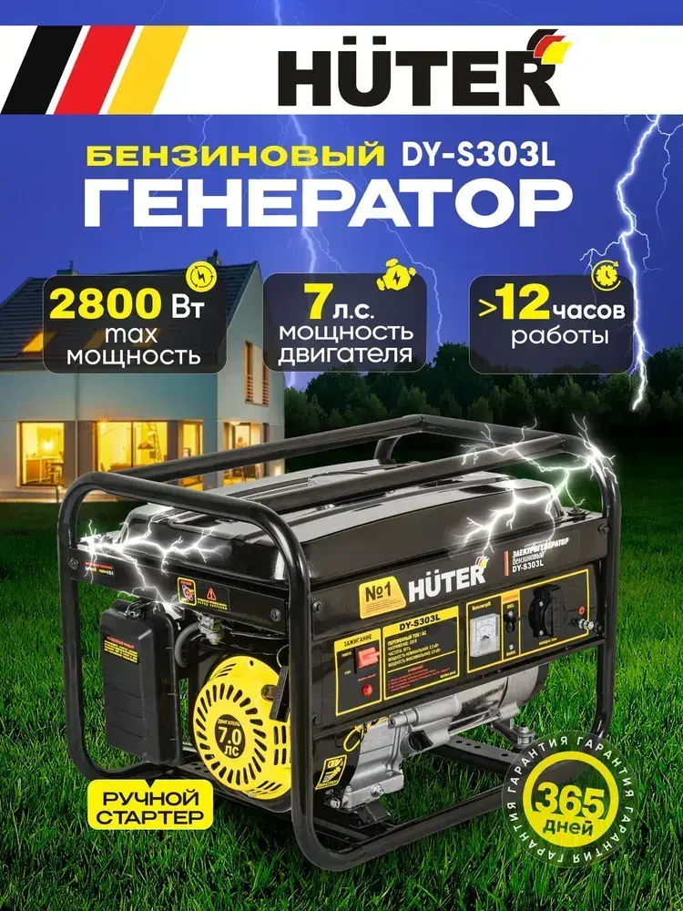 Генератор бензиновый электрический Huter, 2.5 кВт, ручной стартер, 7 л.с.