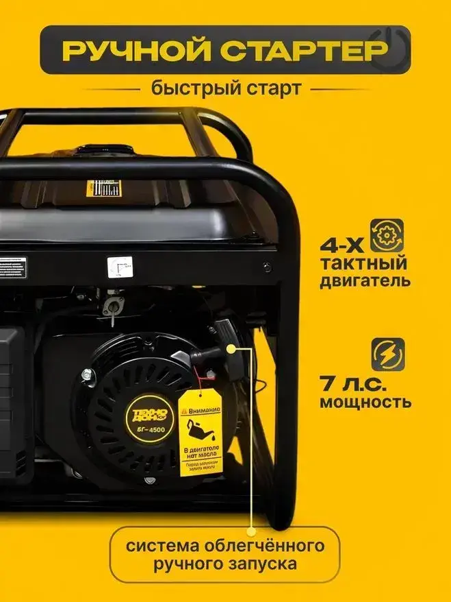 Генератор бензиновый Электрический Техно-Дон БГ-4500 ( 4,75 кВа полная мощность, 220В, 12В, 3,2 3,5 кВт 50 Гц, 7 л.с Ручной стартер Электростанция для Дома)