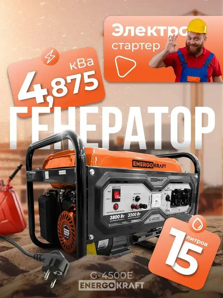 Генератор бензиновый ENERGOKRAFT G-4500E (4.875 кВа, электростартер, 4-тактный двигатель, 3.8 кВт, 220В, топливный бак 15 л, защита от перегрузки)