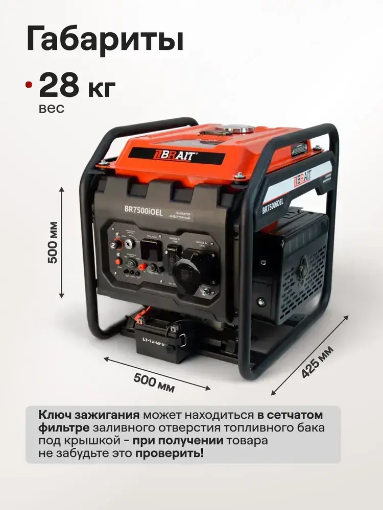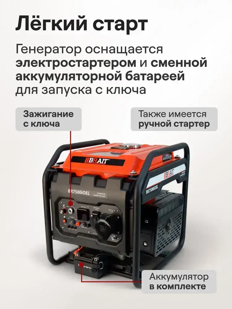 Генератор бензиновый инверторный BR7500iOEL Brait ( max мощность 5.5 кВт, бак 12 л, ручной.электрический запуск, 230В, 50Гц )/ бензогенератор / резервный источник питания