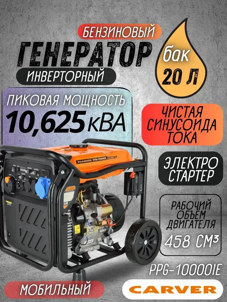 Генератор бензиновый инверторный CARVER PPG -5100I (4,2/4,5 кВт,220В, 2 розетки, USB, дисплей,объем бака 12 л) / бензогенератор / резервный источник питания