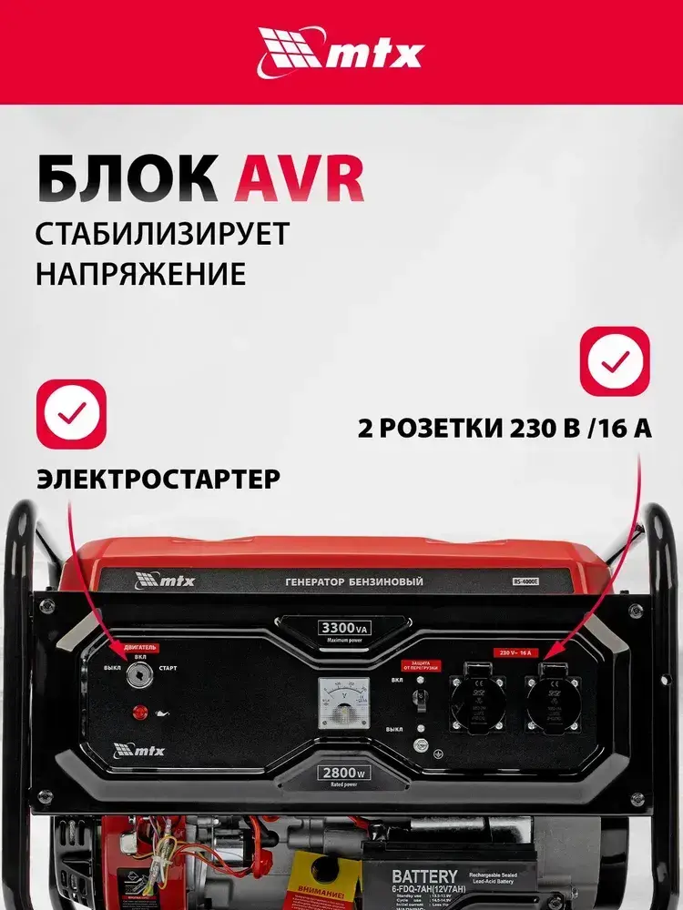 Генератор бензиновый MTX RS-4000E, 3.3 кВт мощность и 208 см3 объем двигателя, 15 л объем топливного бака, электростартер и блок AVR, 2 розетки и датчик уровня масла, 946125