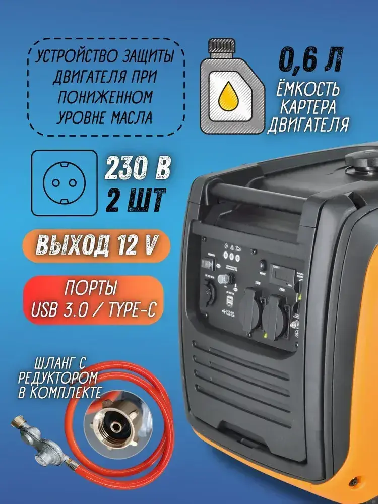 Генератор инверторный Carver PPG-4500IS DUOMATIC (4 кВт, бак 12 л, ручной запуск, бензин + газ, Quick Charge USB 3.0 / Type-C, дисплей) / для автономного снабжения