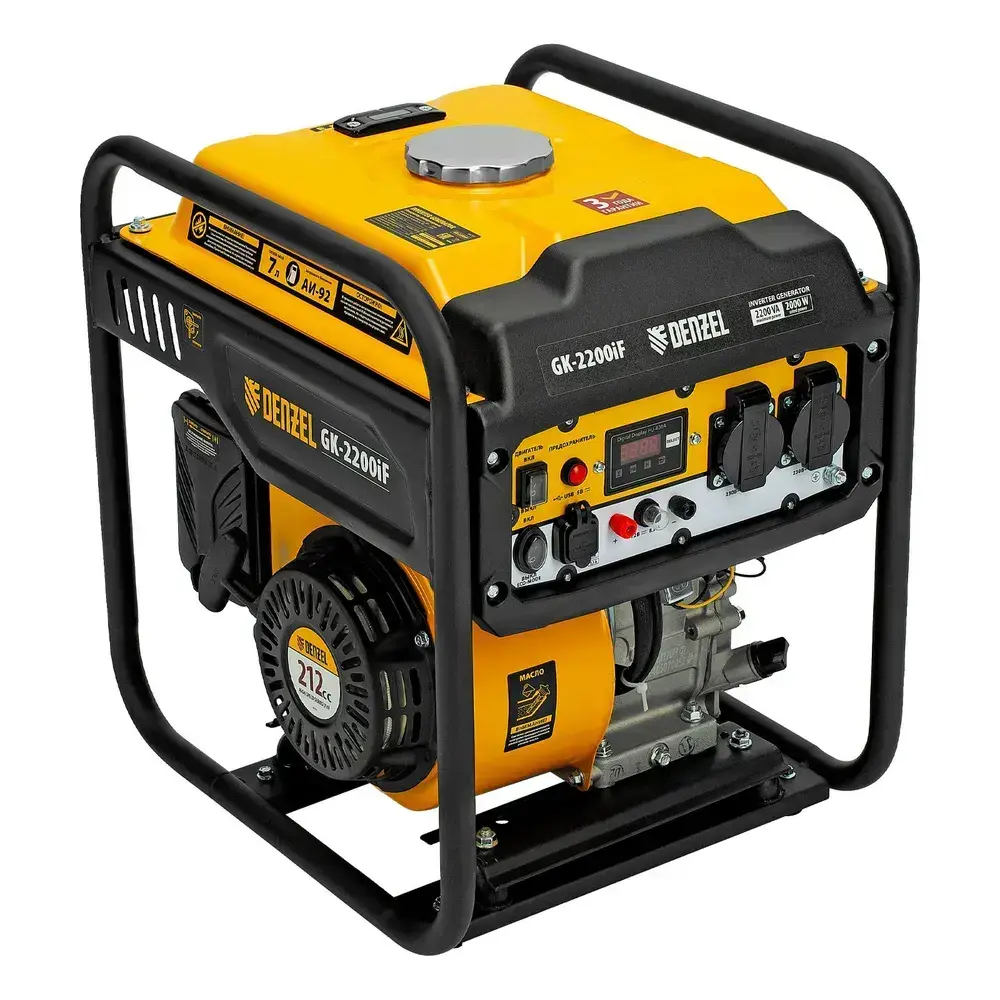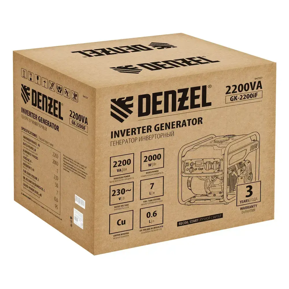 Генератор инверторный DENZEL GK-2200iF, 2.2 кВт и 212 см3 объем двигателя, 7 л объем топливного бака, ручной старт и 2 розетки, выход USB 5В и клеммы постоянного тока 12В 94707