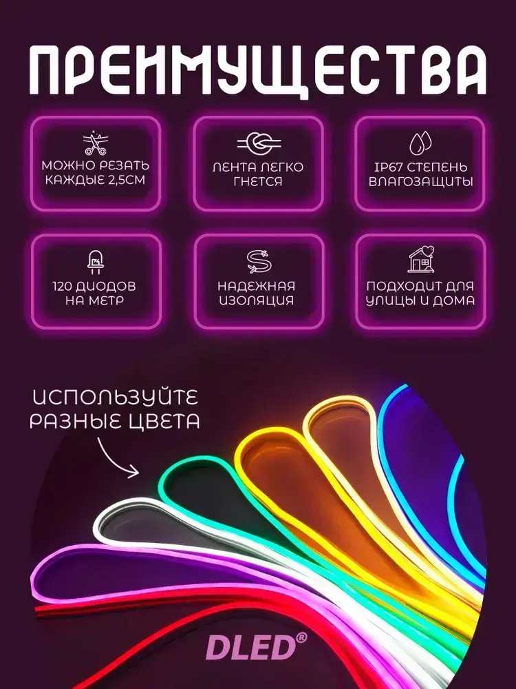 Гибкая led неоновая лента от DLED длина 5м 6ммх12мм 12V DC 120 LED/m синий цвет