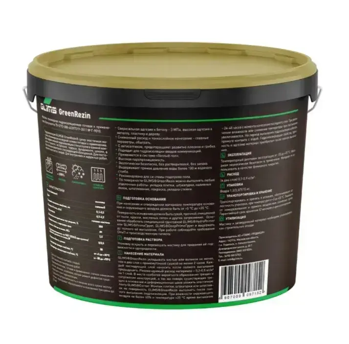 Гидроизоляция эластичная Glims GreenRezin мастика глимс для ванных комнат, кухни, балкона, стен и пола 1.3 кг