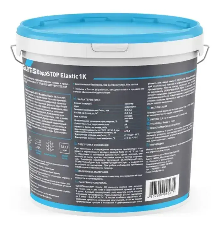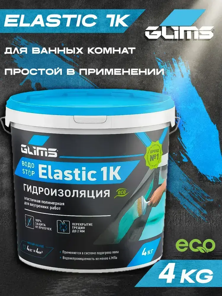 Гидроизоляция эластичная с антисептиком Glims ВодоStop Elastic 1K глимс мастика для стен и пола, ванной комнаты, кухни, балкона 4 кг