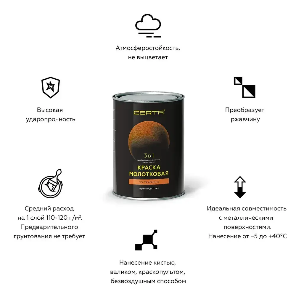 Грунт-эмаль 3 в 1, молотковая краска по металлу, по ржавчине, быстросохнущая, полуглянцевое покрытие, черная, 0,8 кг