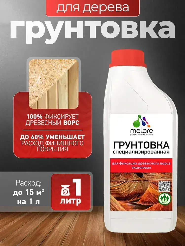 Грунтовка Malare для фиксации древесного ворса, для дерева, для мебели кухонных фасадов, окон и дверей, для любых деревянных поверхностей, акриловая, универсальная, 1 л