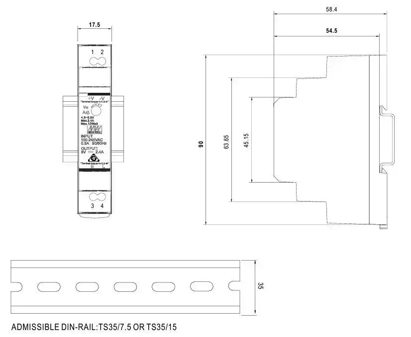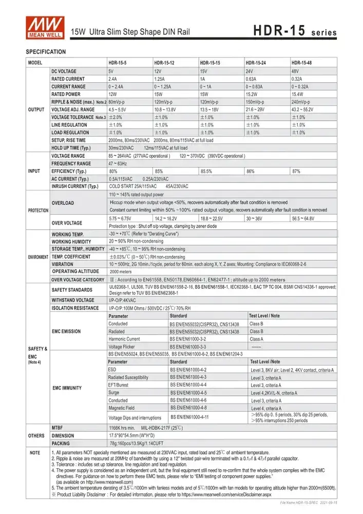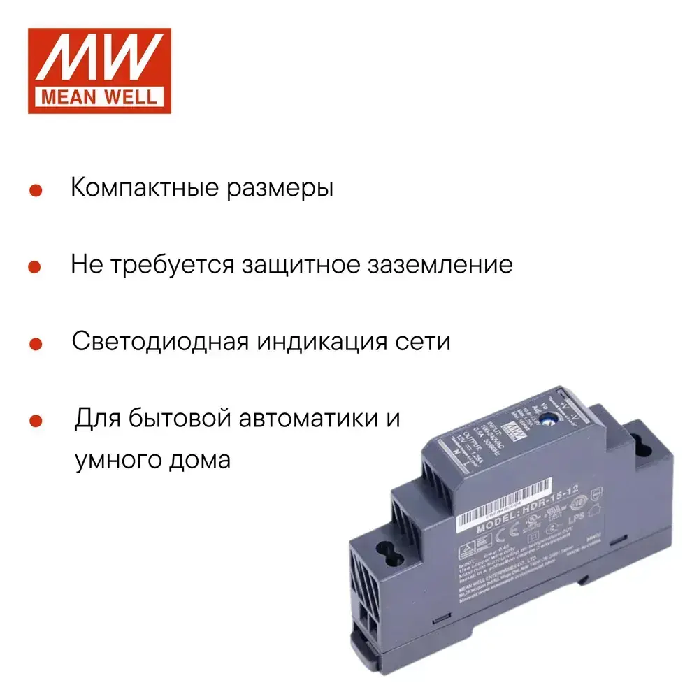 HDR-15-12 MEAN WELL, Блок питания на DIN-рейку, AC/DC 15 Вт 12 В 1,25 А ультратонкий 17,5 мм (1 SU), со светодиодной индикацией сети и комплексом защит, не требующий заземления, для умного дома