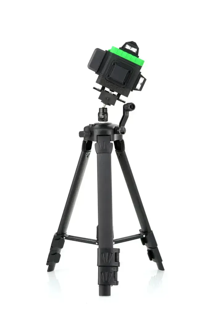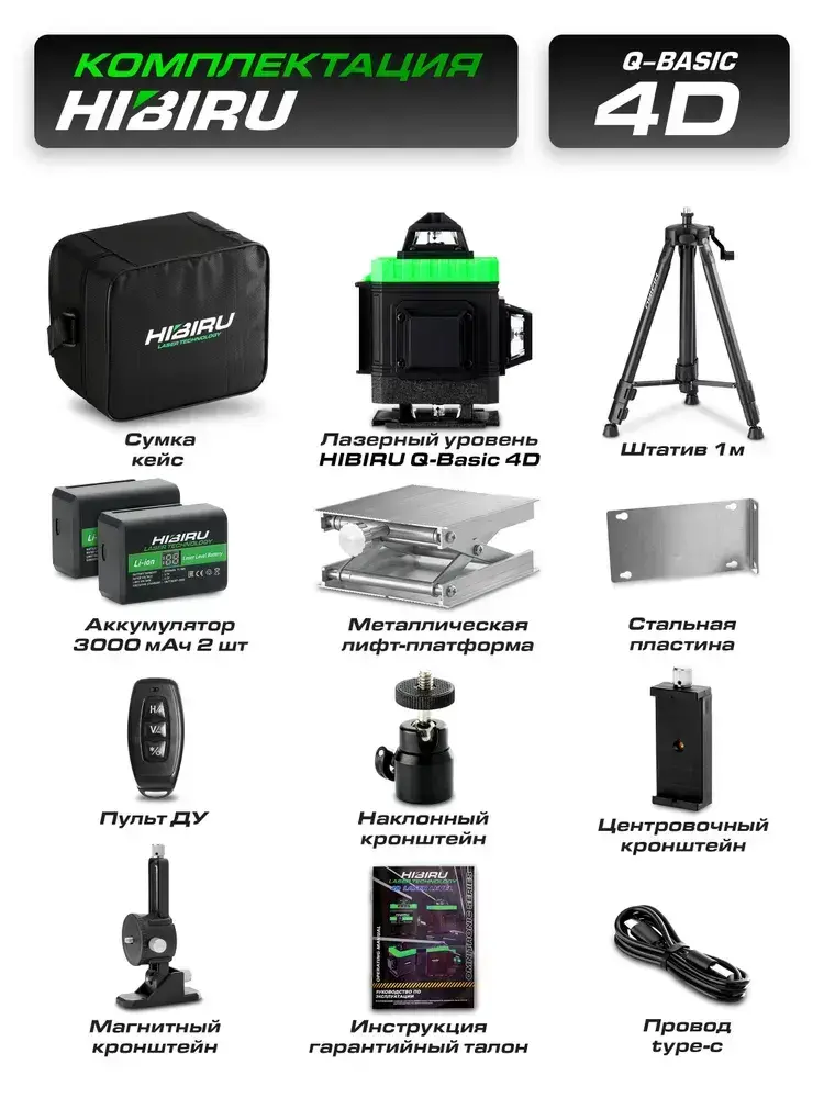 HIBIRU / Профессиональный лазерный уровень 4D со штативом, зеленый луч, Q-Basic, дальность 30м, 16 лучей 360 градусов, самовыравнивание, 2 АКБ кейс, пульт, магнитное крепление, откалиброван, гарантия
