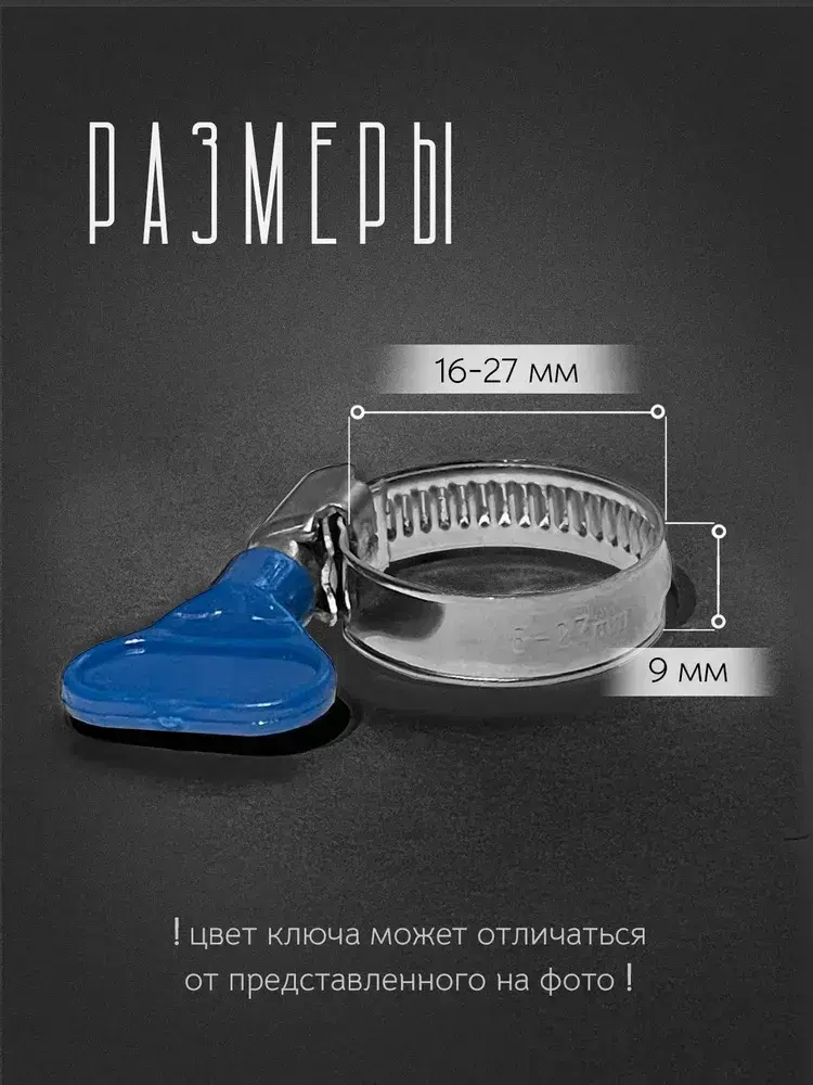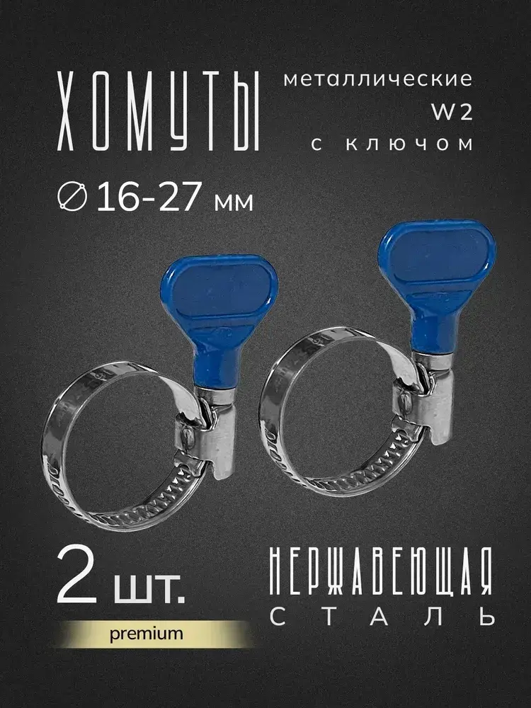Хомуты металлические с ключом для шланга 16-27 мм, нержавеющая сталь, 2 шт