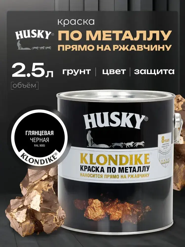 HUSKY KLONDIKE, Краска по металлу черная глянцевая, RAL9005, по ржавчине, антикорозионная, атмосферостойкая, 2,5 л