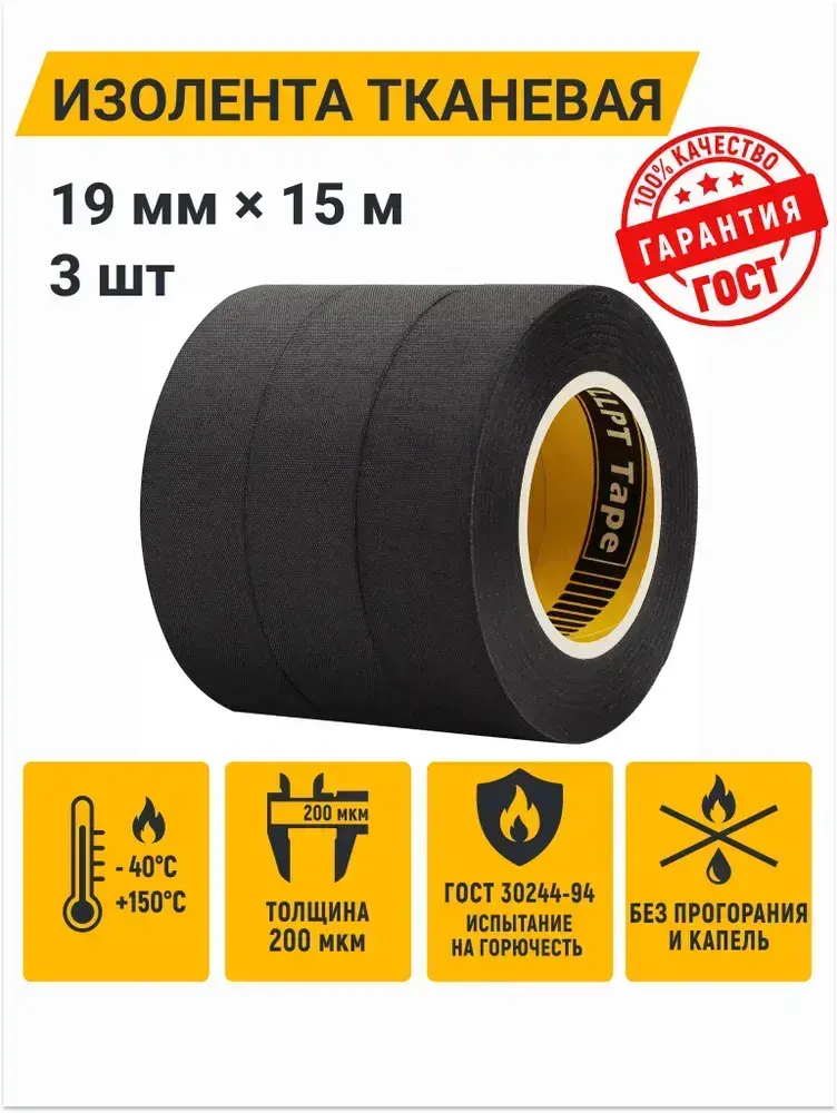 Изолента термостойкая тканевая для проводов, 3шт., 19мм*15м, / изолента черная для проводки набор