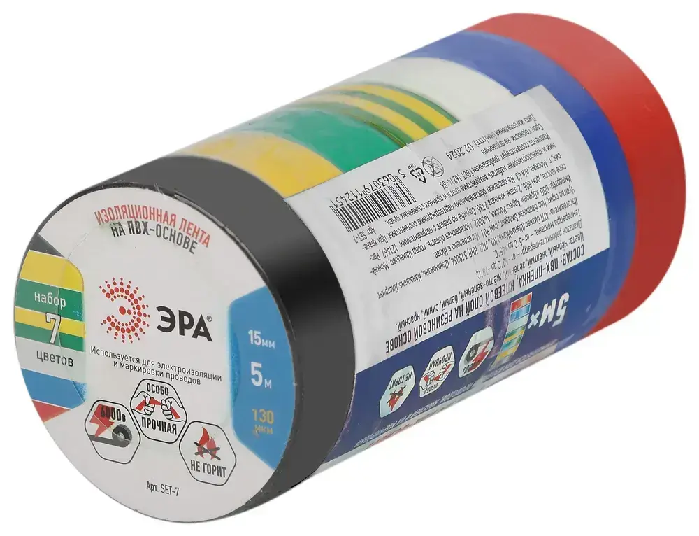 Изолента цветная набор 7 шт ПВХ ГОСТ ЭРА профессиональная для проводов, для проводки 15мм х 5м