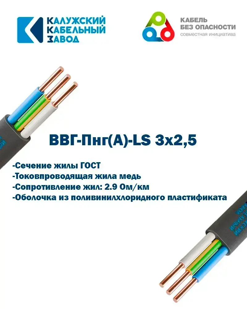Кабель ВВГ-Пнг(А)-LS 3х2,5 ГОСТ, бухта 100метров, Калужский кабельный завод