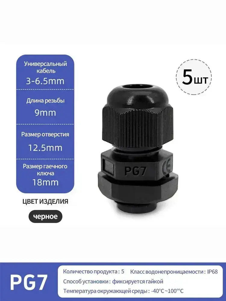 Кабельный ввод (сальник) PG7(3-6.5 мм, IP68) 5 шт.