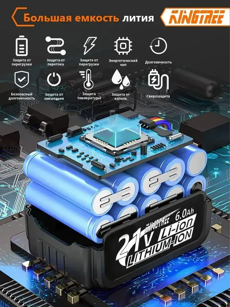 Kingtree DTW800 "1/2" дюйма бесщеточный электрический ударный гайковерт, крутящий момент 2100 Н.м, со светодиодной подсветкой, легкое снятие гаек (1*6,0 Ач аккумулятор,С 4*гайковертной втулкой)