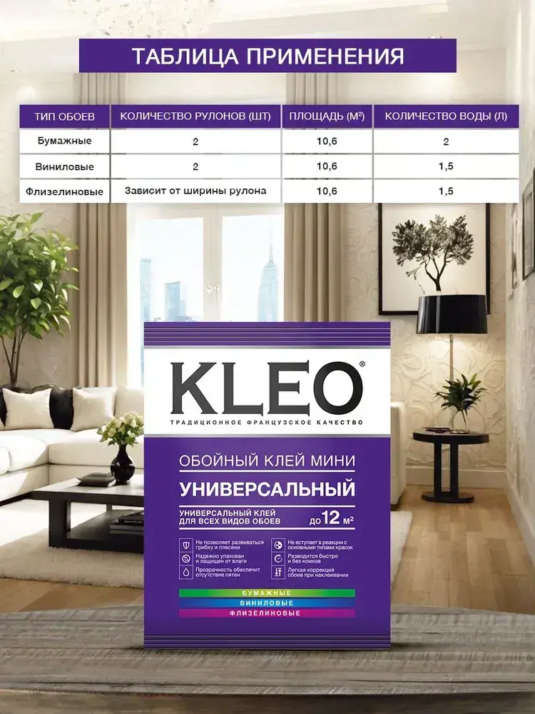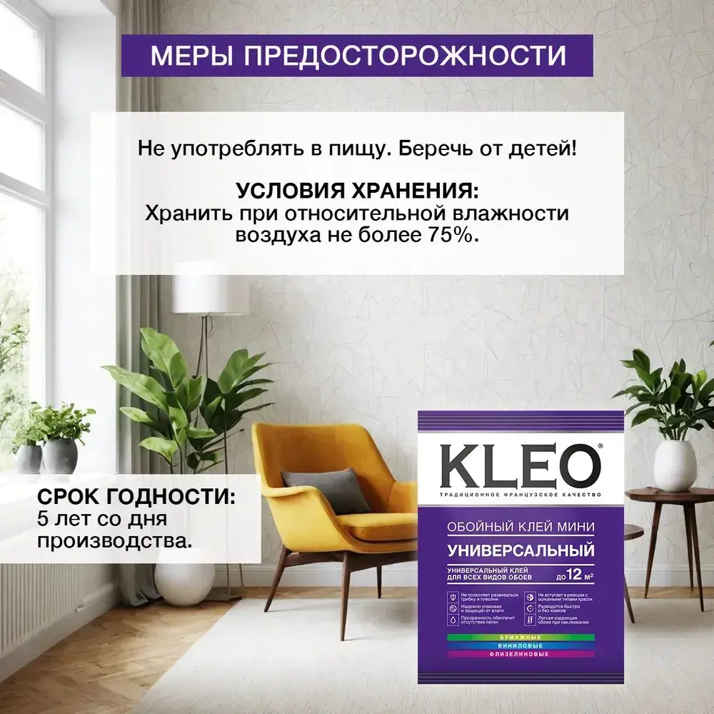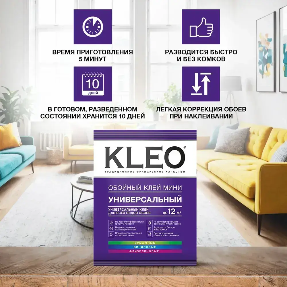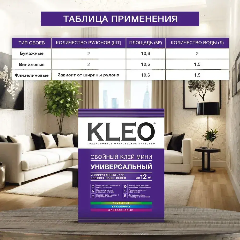 Клей для обоев универсальный KLEO MINI. Для наклеивания всех видов флизелиновых, виниловых, бумажных обоев/ Для внутренних работ. 60г. до 12 м. кв. 2 рулона