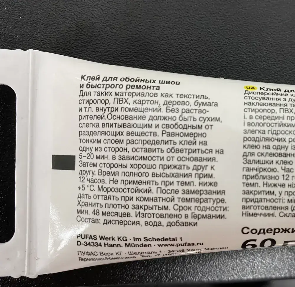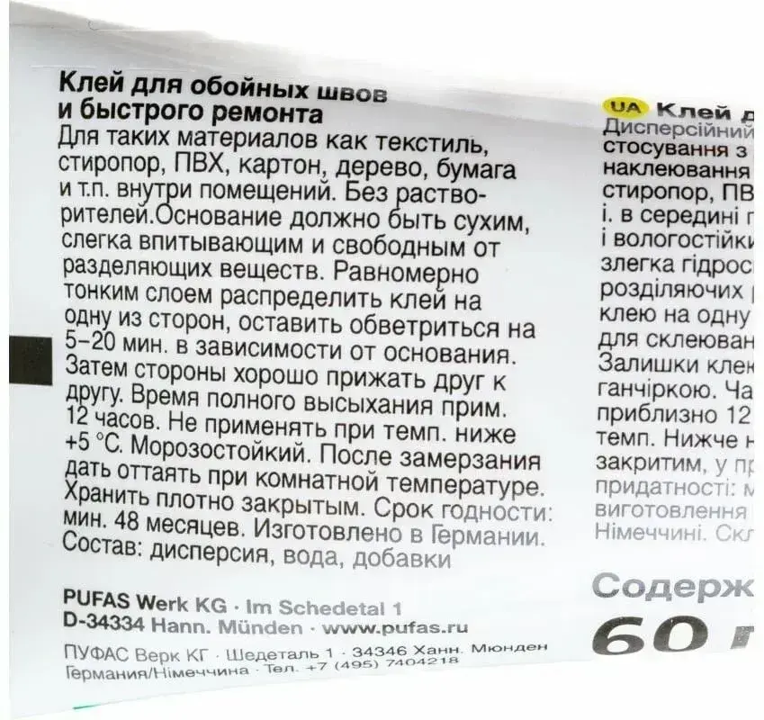 Клей для обойных швов и быстрого ремонта Pufas Uni-Fix 60 г. Германия Пуфас для стыков любых типов обоев для подклейки обоев