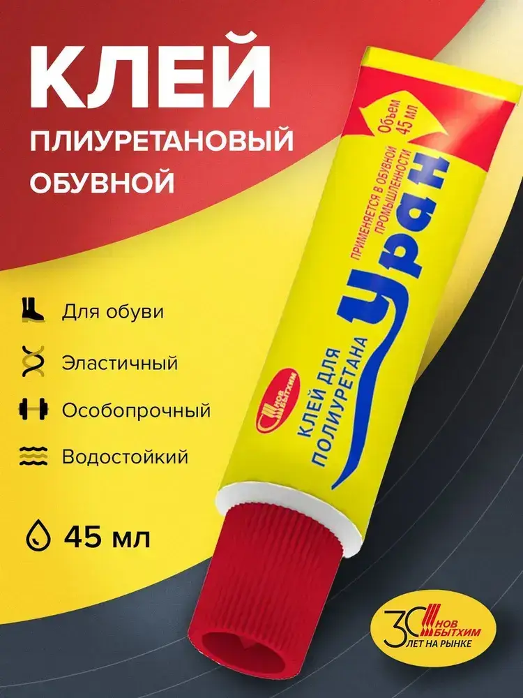 Клей для обуви Уран, подходит для кожи, резины, полиуретана, пластика, ткани, высокопрочный водостойкий эластичный Новбытхим 45 мл