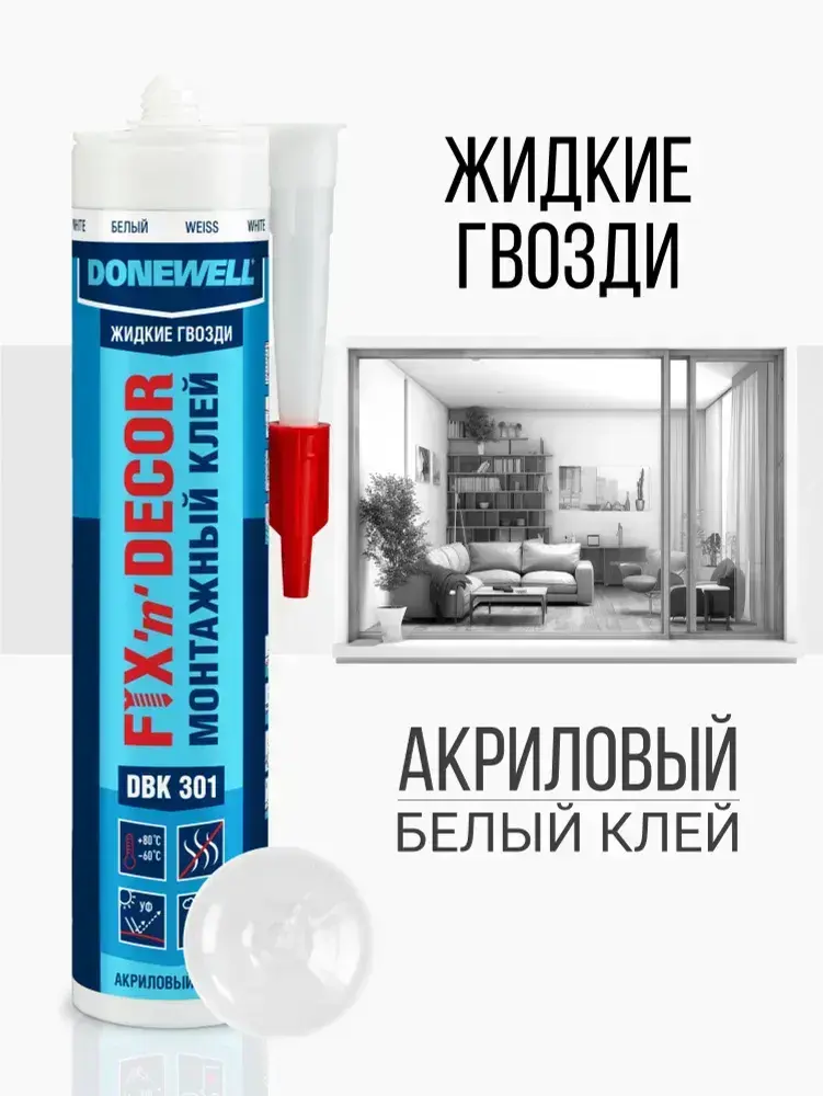Клей монтажный "Жидкие гвозди" DONEWELL FIX-N-DECOR акриловый морозостойкий, DBK-301, Белый