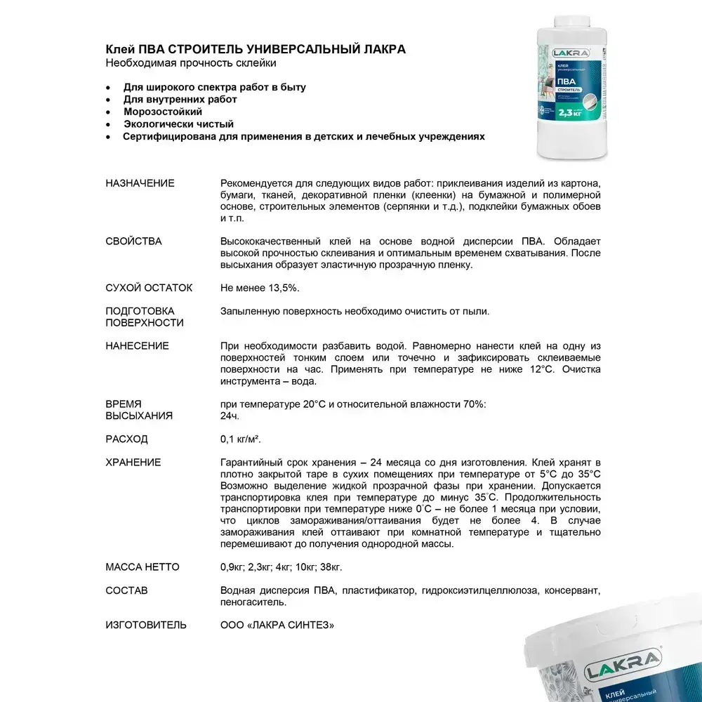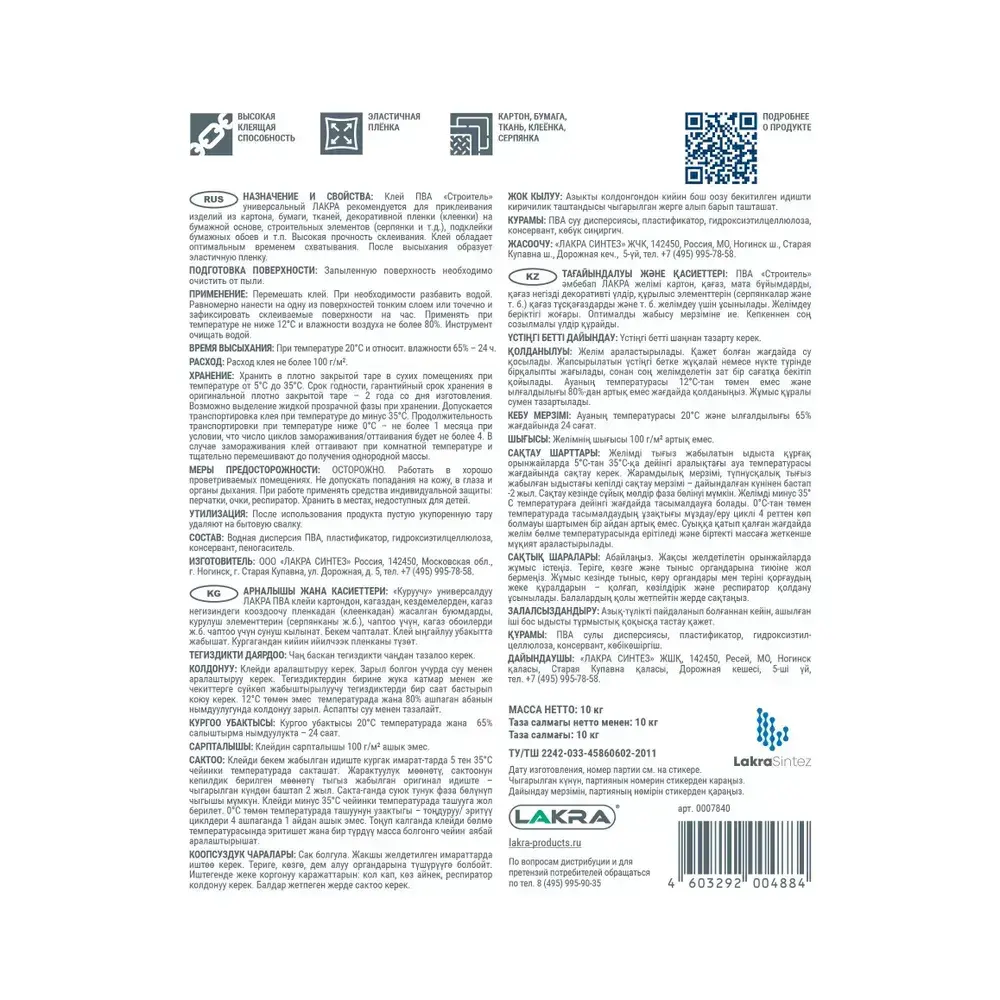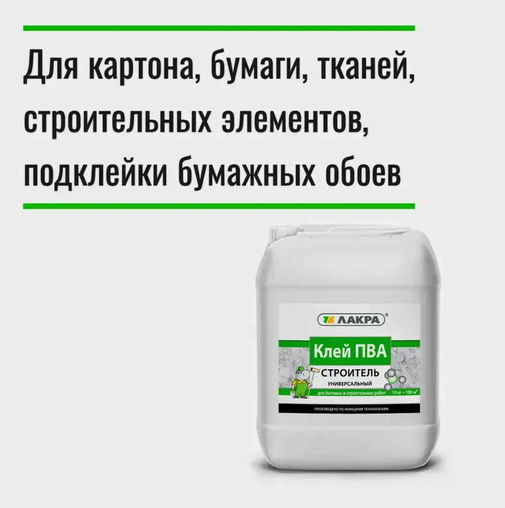 Клей ПВА ЛАКРА Строитель универсальный, 10 кг