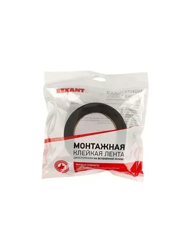 Клейкая лента двусторонняя 5 м х 40 мм REXANT на вспененной ЭВА основе, черная, двухсторонний скотч