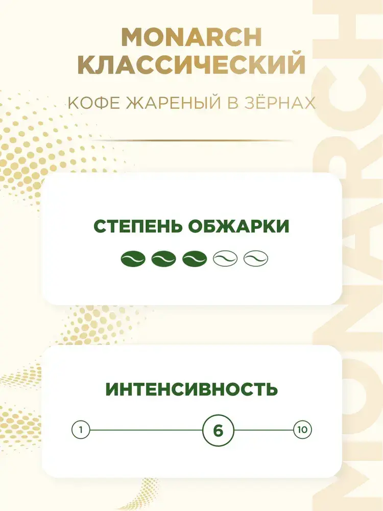 МИР МЕНЯЕТСЯ, И МЫ ВМЕСТЕ С НИМ. ВСТРЕЧАЙТЕ КОФЕ MONARCH! ВСЕ ТОТ ЖЕ ЛЮБИМЫЙ ВКУС И АРОМАГИЯ: Богатый, насыщенный вкус и волшебная сила Аромагии остаются с вами в каждой чашке кофе Monarch! Мы сохраняем высокое качество и традиции производства, чтобы вы всегда могли наслаждаться любимым кофе. ТЕ ЖЕ САМЫЕ КАЧЕСТВО И ПРОИЗВОДСТВО Наша компания всегда заботится о том, чтобы качество продукта оставалось неизменным, и потребитель мог в любой чашке кофе почувствовать тот же вкус и аромат, к которому он привык за многие годы. Эту задачу решают специалисты отдела исследований и разработки отдела качества. Рецептура нашего кофе уже более 22 лет контролируется строгими стандартами. Это контроль каждого этапа производства и всех процессов приготовления того же самого качественного кофе, который вы так любите. Чтобы обеспечить соответствие высоким стандартам компании, входной контроль качества сырья осуществляется на постоянной основе. РЕЦЕПТ АЙРИШ КОФЕ: ИНГРЕДИЕНТЫ: 300 мл воды; 3 чайные ложки кофе Monarch Original; 2 столовые ложки (30 мл) виски; 2 чайные ложки коричневого сахара; 0,4-0,6 стакана взбитых сливок; СПОСОБ ПРИГОТОВЛЕНИЯ: Приготовьте две кофейные чашечки для напитка. Слегка взбейте сливки до состояния очень мягких пик. Положите 1 чайную ложку сахара и 1 столовую ложку виски в каждую чашку и перемешайте, пока сахар не растворится, а затем налейте кофе в каждую чашку. После нескольких минут добавьте взбитые сливки поверх каждой чашки. ПОПРОБУЙТЕ ТАКЖЕ: Monarch Day&Nigh с низким содержанием кофеина. Наслаждайтесь насыщенным ароматом и деликатным вкусом кофе после обеда и даже поздним вечером. Monarch Gold — насладитесь кофе с насыщенным сбалансированным вкусом и утончённым ароматом. Monarch Velour — насладитесь кофе с глубоким вкусом и нежной кофейной пенкой. Monarch Caramel — насладитесь аппетитным сочетанием карамельного аромата и вкуса деликатно обжаренных кофейных зёрен. Показать полностью