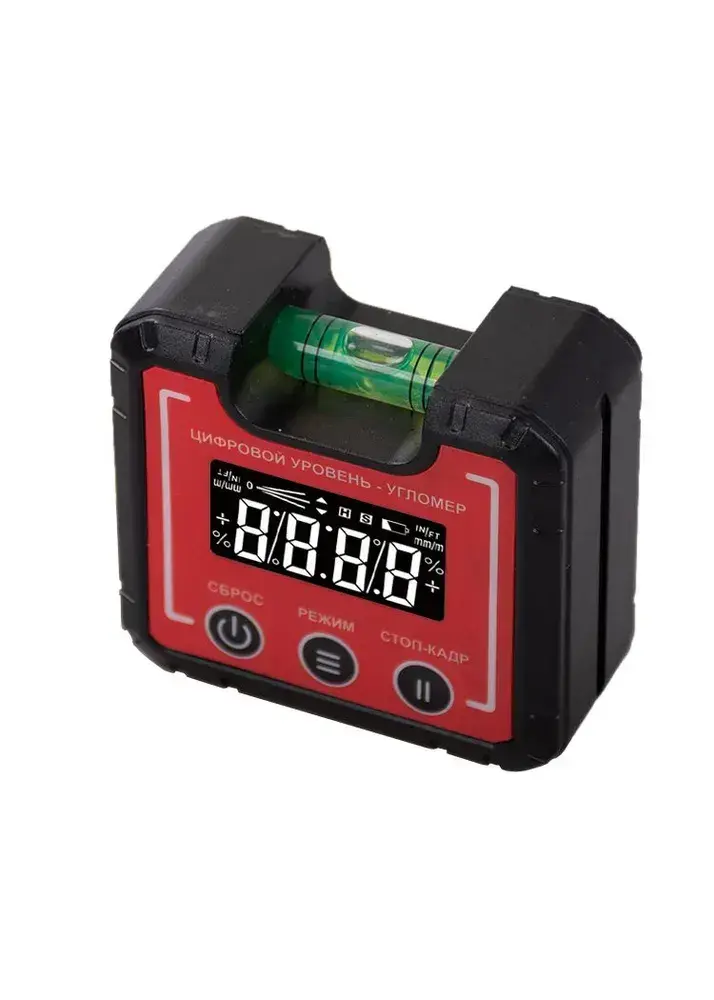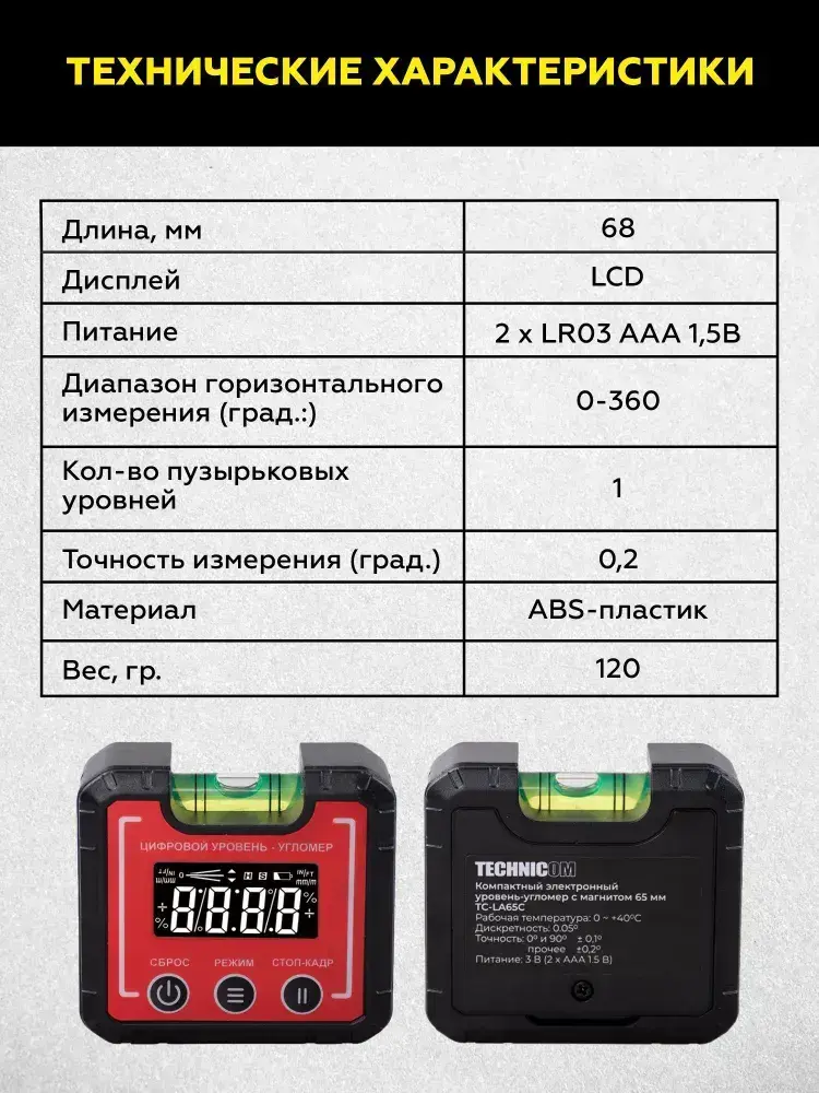 Компактный электронный уровень-угломер с магнитом 65 мм TECHNICOM TC-LA65C - 0-360, ЖК дисплей, 2 магнита, автокалибровка, автоотключение