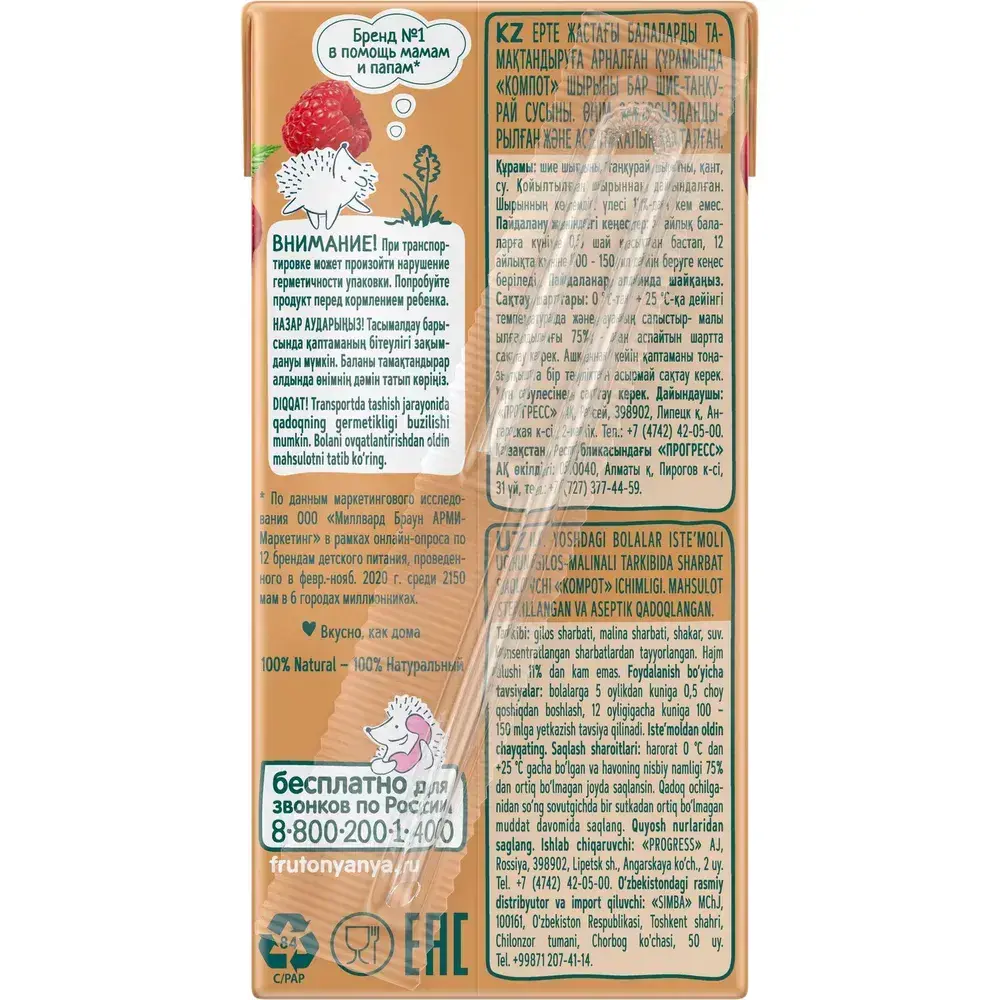 Компот детский ФрутоНяня, из вишни и малины, 0,2 л