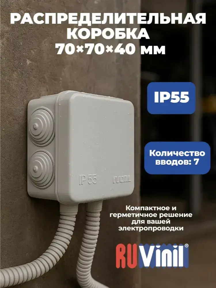 Коробка распределительная ОП 70х70х40мм 7 вводов IP55 серая Ruvinil