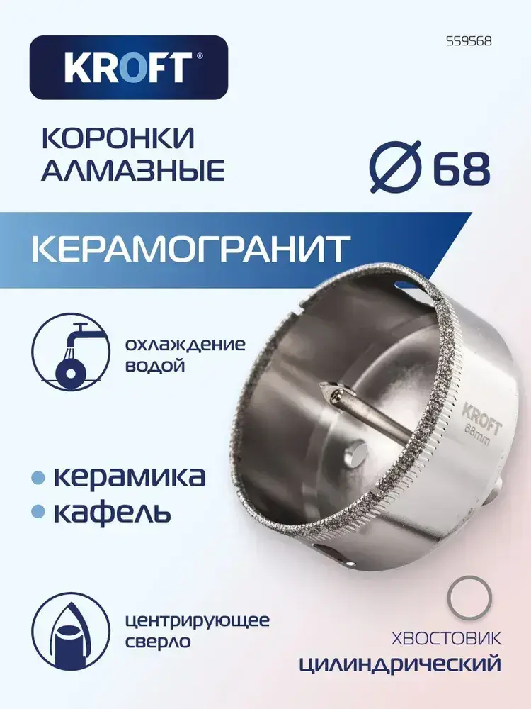 Коронка алмазная 68 мм по керамике цилиндричиский хвостовик KROFT