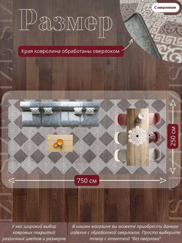 Ковролин метражом 2,5х7,5 м, безворсовой "Каскад", бежево-коричневый с оверлоком