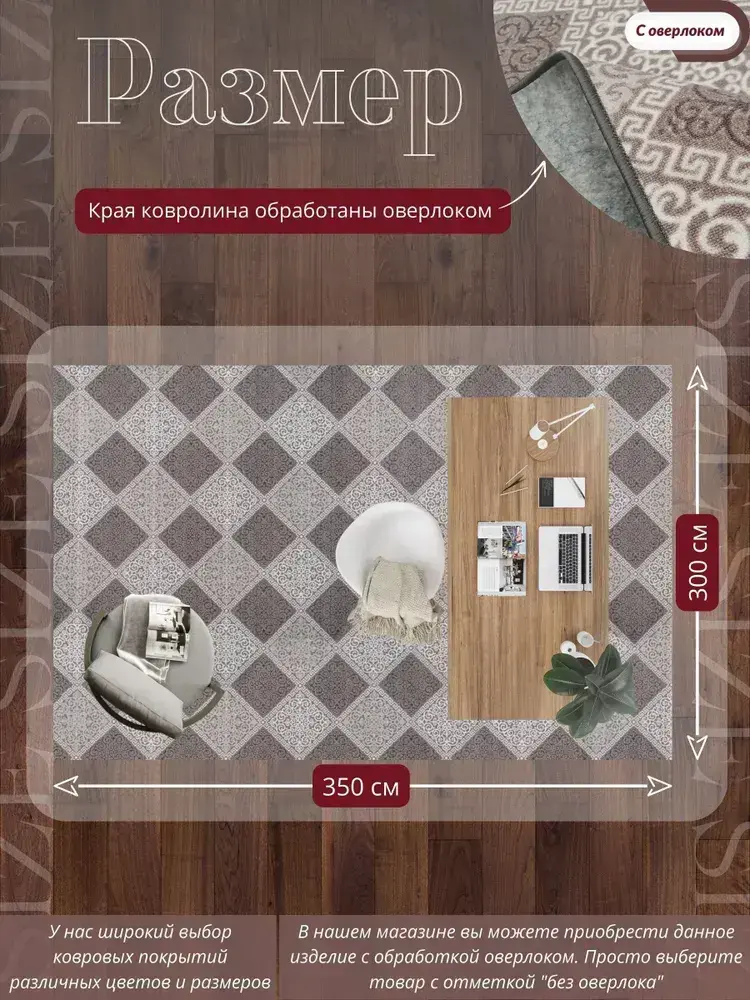 Ковролин метражом 3х3,5 м, безворсовой "Каскад", бежево-коричневый с оверлоком