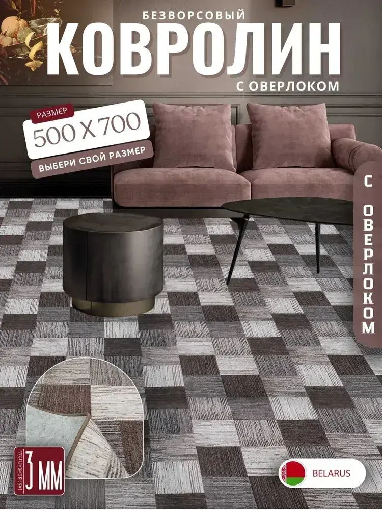 Ковролин метражом 5х7 м, безворсовой "Плитка", коричнево-серая с оверлоком