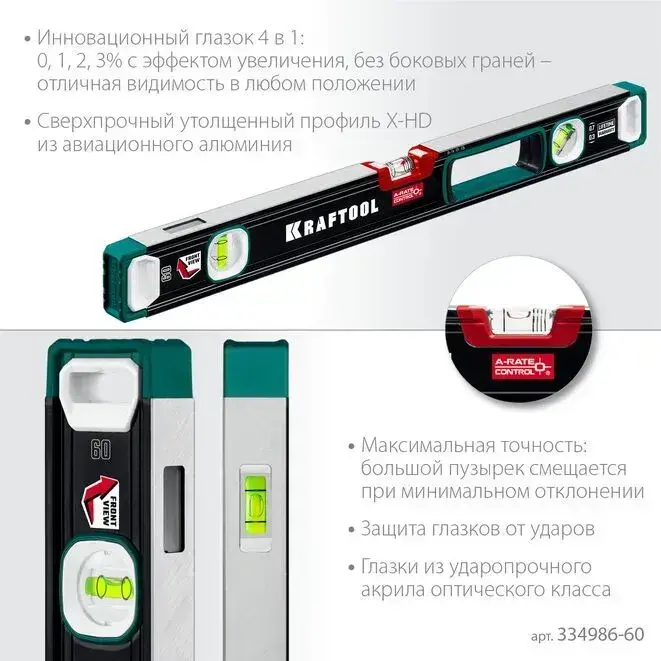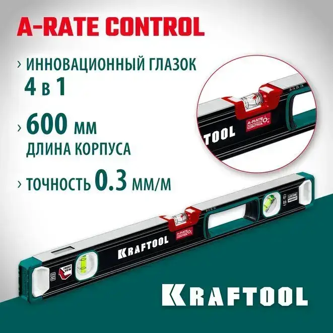 KRAFTOOL A-RATE CONTROL, 600 мм, точность 0.3 мм/м, с инновационным зеркальным глазком, сверхпрочный уровень (34986-60)