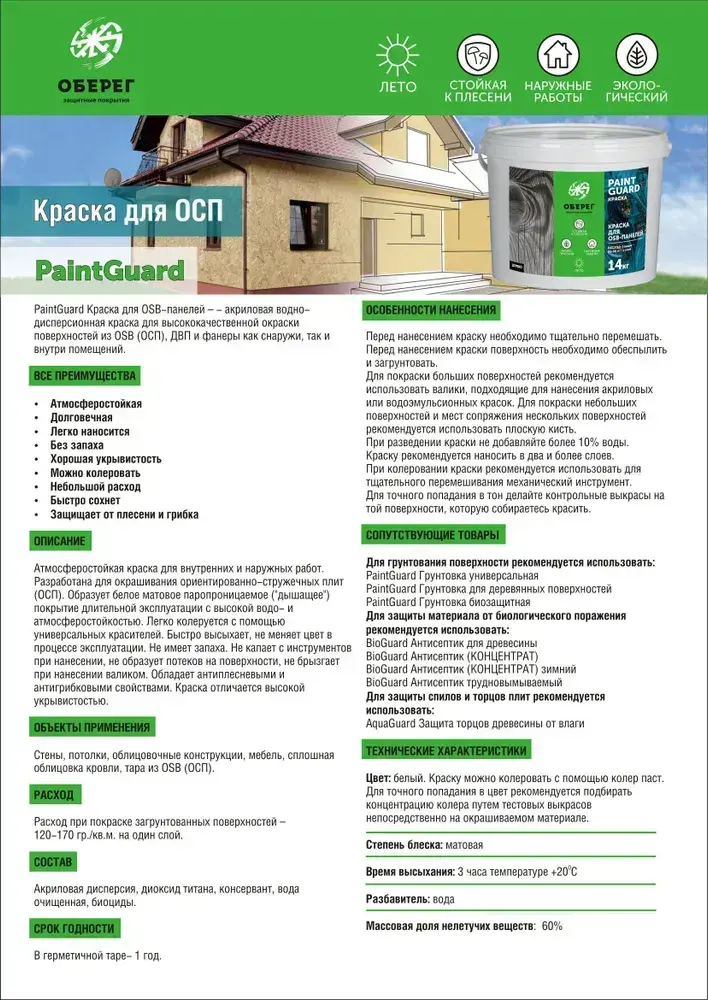 Краска для OSB (ОСБ) панелей и плит ОБЕРЕГ PaintGuard 14кг