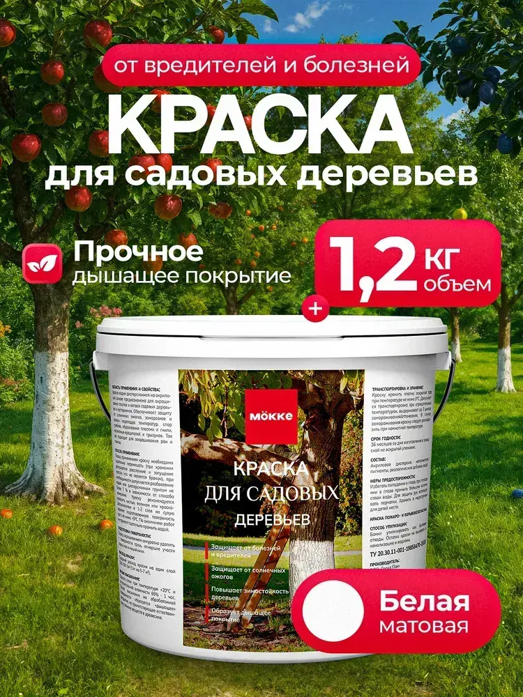 Краска для садовых деревьев и кустарников МОККЕ 1,2кг, побелка для деревьев