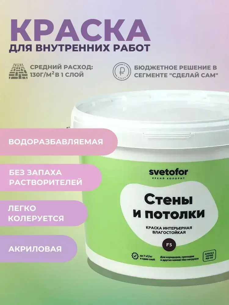 Краска для стен и потолков НЕ МОЮЩАЯСЯ Svetofor F5 Белая 3 кг, водоэмульсионная, матовая, без запаха растворителей